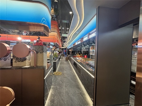 今天分享的是宁夏回香渔自助餐厅装修设计实景,这家自助餐厅装修设计将“潮流科技感”与“轻奢休闲风”两种风格巧妙融合在一起,既贴合当下年轻消费群体的审美偏好,又通过空间层次的营造兼顾了自助餐饮的功能需求,是近年餐饮空间设计的典型流行范式。前厅的顶面与墙面采用波浪形的曲面造型,搭配橙红、宝蓝等高饱和度渐变色彩,叠加内嵌式线性灯带的勾勒,既打破了传统餐厅的规整感,又通过科技感的光影营造出“赛博休闲”的氛围——这种手法既借鉴了网红餐饮的“打卡属性”设计,又通过色彩分区(如橙红对应热菜区、宝蓝对应海鲜区)实现了功能引导,让顾客能快速识别餐区类型。
